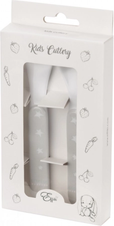 Widelec i łyżeczka z szarymi rączkami ozdobionymi gwiazdkami zachwycają wesołym wyglądem i prostym wzornictwem.