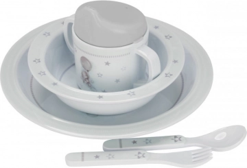 Ten zestaw został zaprojektowany z myślą o najmłodszych: jego forma ułatwia trzymanie i użytkowanie. Antypoślizgowa guma na spodzie talerza, miski i kubka pomaga utrzymać naczynia stabilnie na miejscu podczas posiłku, co wspiera samodzielność przy jedzeniu.