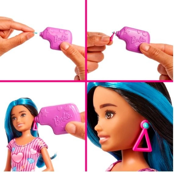 Z zestawem Barbie Skipper Pierwsza praca dzieci mogą spróbować nowej roli i przeżywać własne przygody! Zestaw zawiera lalkę Skipper oraz narzędzie do piercingu uszu, które pozwala bawić się w profesjonalną piercerkę. Przymocuj kolczyk do różowego zaczepu na narzędziu, a następnie dociśnij do już przekłutych uszu lalki, aby stworzyć nową stylizację. Ten magiczny moment można powtarzać w kółko.