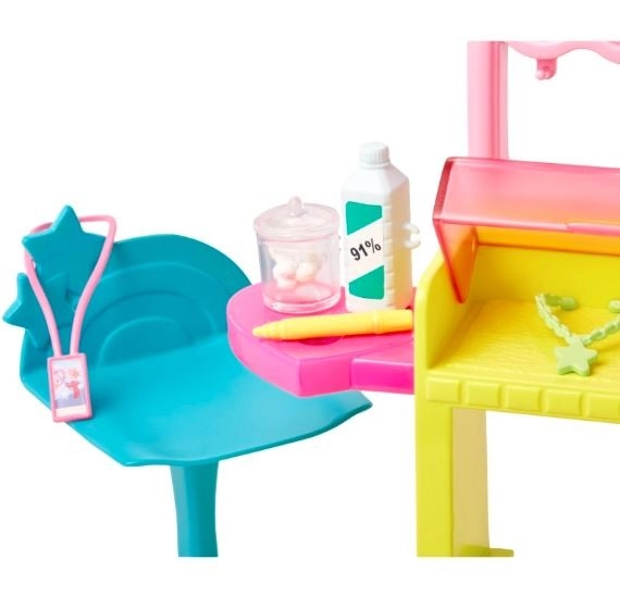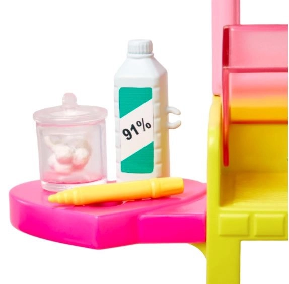 Stanowisko do piercingu uszu oferuje miejsce do prezentacji kolczyków, przechowywania akcesoriów lalki oraz fotel dla klientów. Wśród dodatkowych elementów znajdują się płyn dezynfekujący, waciki, identyfikator pracowniczy, marker do uszu oraz 2 naszyjniki, które wzbogacają zabawę. Ta wyjątkowa metamorfoza może być powtarzana wielokrotnie, co czyni ten zestaw z lalką Skipper idealnym prezentem dla dzieci od 3 lat.