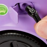 Auto ma stylowy fioletowy design z realistycznymi elementami, w tym pasy bezpieczeństwa i lusterko wsteczne.