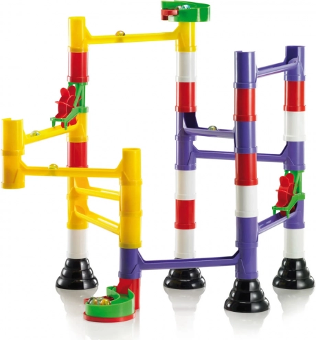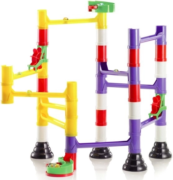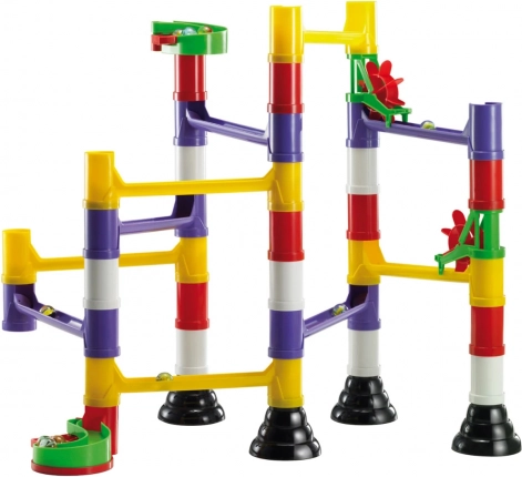 Modułowe rurki, słupki i szyny precyzyjnie do siebie pasują. Dzieci szybko zrozumieją logikę budowania i mogą nieustannie zmieniać trasę kulek.