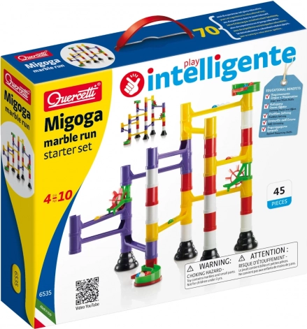 Zestaw startowy Migoga oferuje barwną konstrukcję z solidnymi podstawami, słupkami i kolorowymi torami, które łatwo się wczepiają. Dzięki koszom zbierającym, spiralom, mostkom, młynkom i sprężynowym podajnikom stworzysz płynne i dynamiczne trasy, po których kulki pędzą z poziomu na poziom.