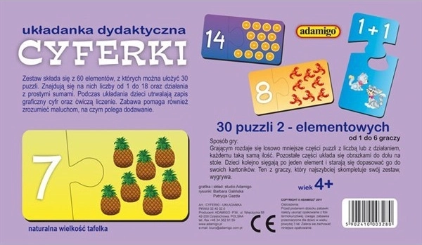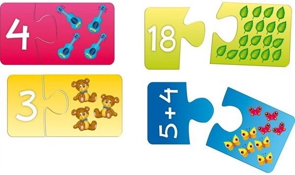 Dzięki tej grze dziecko ćwiczy koncentrację i uczy się analizować. Edukacyjne puzzle składają się z 30 dwustronnych układanek z liczbami po jednej stronie i odpowiadającą im liczbą obiektów po drugiej stronie.