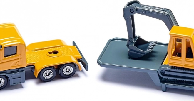 Metalowe i plastikowe elementy, gumowe opony oraz tylne zabezpieczenie zapewniają bezpieczny transport maszyny. Koparka, która jest częścią zestawu, to wyjątkowy model odzwierciedlający rzeczywisty wygląd z ruchomymi częściami. To atrakcyjny model dla miłośników pojazdów budowlanych w każdym wieku.