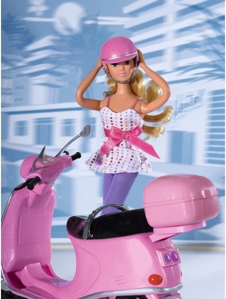 Lalka Steffi w letnim stroju, z kaskiem i okularami przeciwsłonecznymi, na skuterze z kufrem.