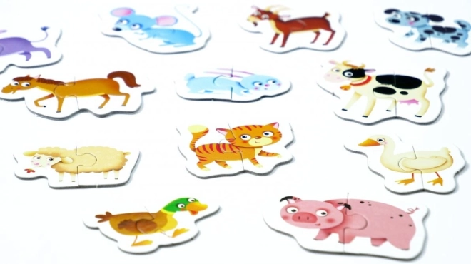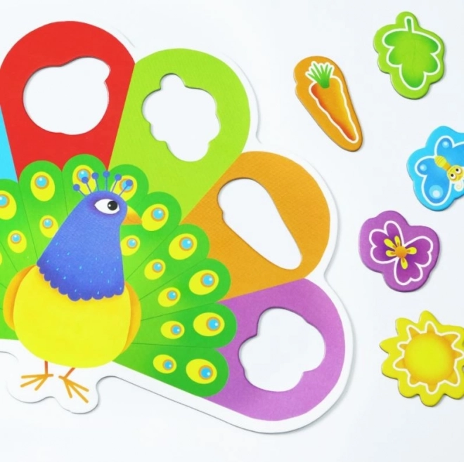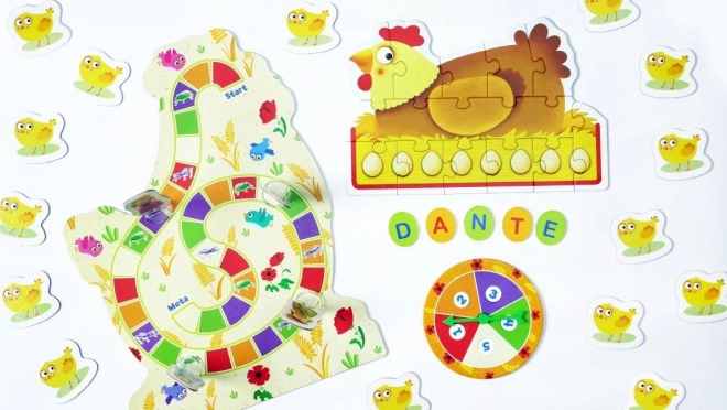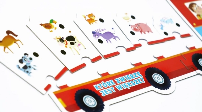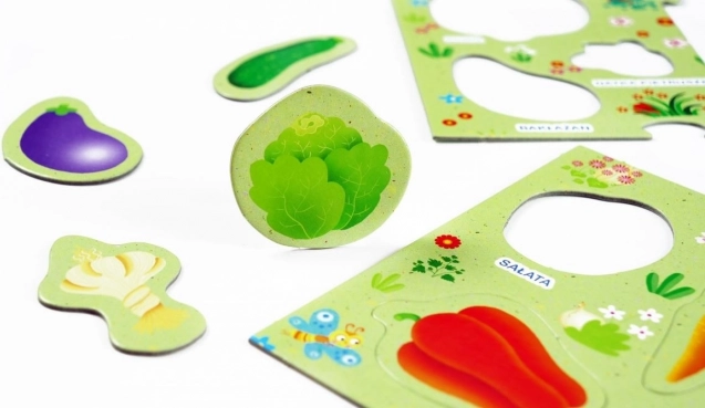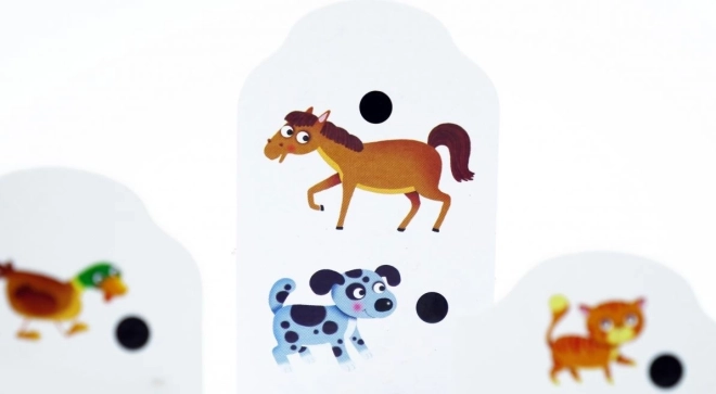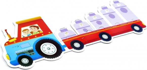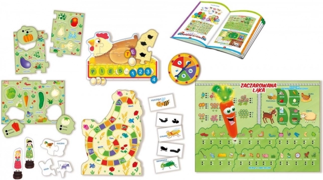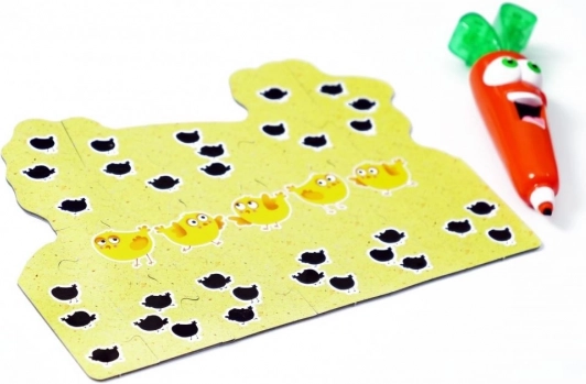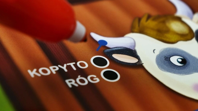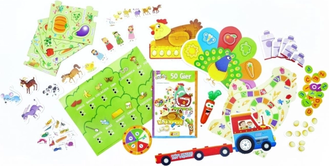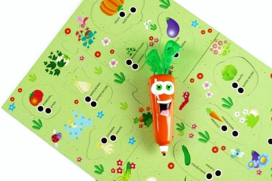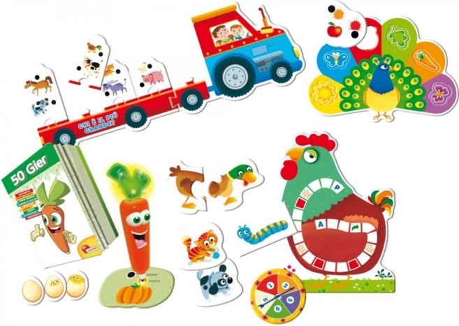 Dzieci mają do dyspozycji grającą i świecącą marchewkę oraz wiele materiałów z grubego kartonu z wizerunkami przyjaznych zwierząt i przedmiotów ze świata farmy.