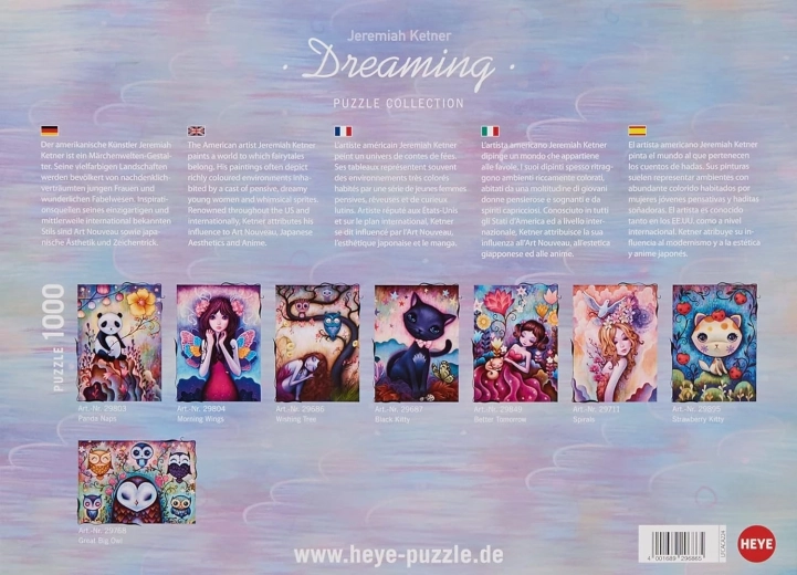 Odkryj magiczny świat artysty Jeremiah Ketnera z puzzlami HEYE Dreaming – Drzewo życzeń, 1000 elementów. Ciesz się wysokiej jakości nadrukiem, precyzyjnym wycięciem i urzekającą ilustracją inspirowaną secesją, estetyką japońską i stylem anime. Idealne do relaksu i jako stylowy prezent.