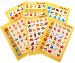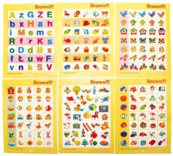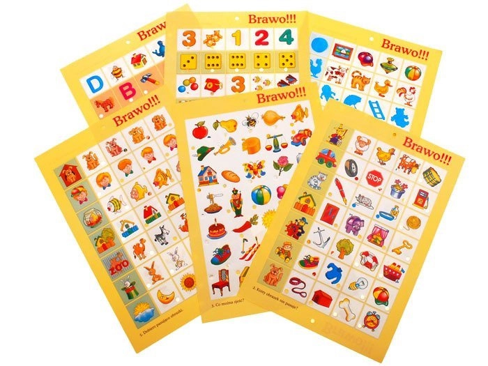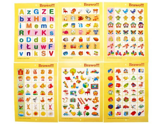 - 12 plansz tematycznych: połącz właściwy element z obrazkiem, co nie pasuje, co można zjeść, co służy do zabawy, dobierz w pary, znajdź podobne obrazki, taka sama ilość, co do czego pasuje, obrazek do literki, połącz takie same literki, do kogo należy cień, znajdź identyczny obrazek.