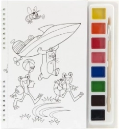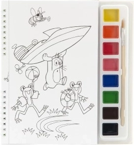 Ten kreatywny zestaw kolorowanek z motywem Krecik i helikopter ucieszy dzieci lubiące tworzyć. W komplecie znajdują się farby wodne oraz pędzelek z naturalnym włosiem dla łatwego rozprowadzania i płynnych pociągnięć. Kartki można prosto wyjąć i kolorować na podkładce, w domu i w podróży.