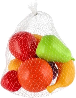 Banan, jabłko, gruszka, cytryna, pomarańcza, truskawka i winogrona – idealne do nauki nazw i kolorów oraz do zabawy w kucharza lub sklep.