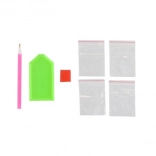 W zestawie znajdziesz płótno z nadrukowanym obrazkiem, pióro do aplikacji kamyków, miseczkę na kamyki, wosk i zestaw kolorowych kamyków.