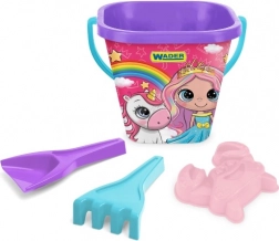 Odkryj radość zabawy w piasku z zestawem do piasku IML, 4 elementy. Praktyczne wiaderko 2 l z mocną rączką i nieścieralnym nadrukiem IML (np. księżniczki z tęczą i jednorożcem lub wesołe autka) uzupełniają łopatka, grabki i foremka krab lub łódeczka. Wytrzymałe wykonanie znosi słońce i wodę, gotowe na codzienne przygody na plaży i placu zabaw.