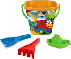 • Kompletny zestaw: łopatka, grabki, foremka (krab lub łódeczka) oraz kwadratowe wiaderko 2 l.
