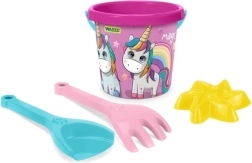 Kompletny zestaw: wiaderko, łopatka, grabki i foremka do robienia babek i zamków z piasku.