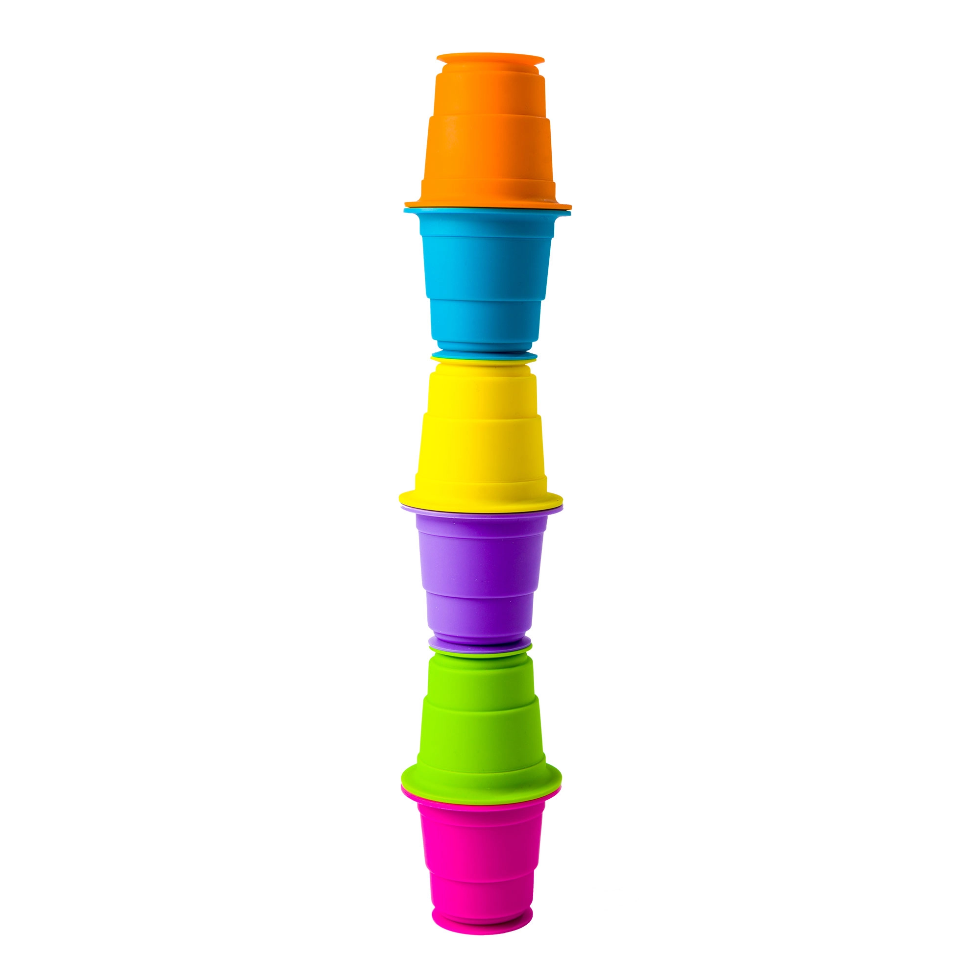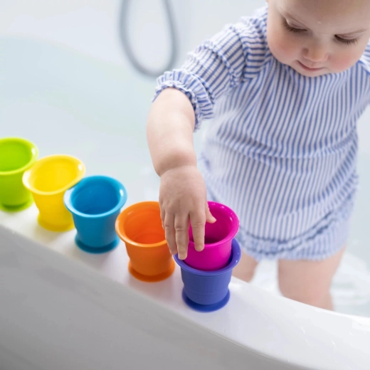Zabawa kubeczkami wspiera małą i dużą motorykę, koordynację oko–ręka oraz rozróżnianie kolorów. Dzieci mogą używać kubeczków do przelewania wody, sortowania według rozmiaru i koloru lub jako pierwszej konstrukcyjnej zabawki, która rośnie wraz z ich umiejętnościami.