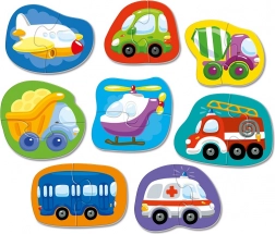 - 8 oddzielnych mini puzzli z konturami środków transportu