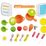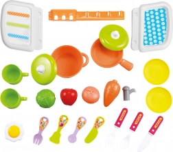 W zestawie znajduje się bogate wyposażenie, które naśladuje prawdziwe kuchenne akcesoria. Dzieci mogą „gotować”, serwować i sprzątać, co wspiera samodzielność i kreatywne myślenie.