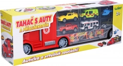 W skład zestawu wchodzi 5 samochodzików i 1 helikopter, więc zabawa może zacząć się od razu po rozpakowaniu. Praktyczny wysuwany uchwyt na górnej części przyczepy ułatwia przenoszenie. Dostarczane w czeskim opakowaniu.