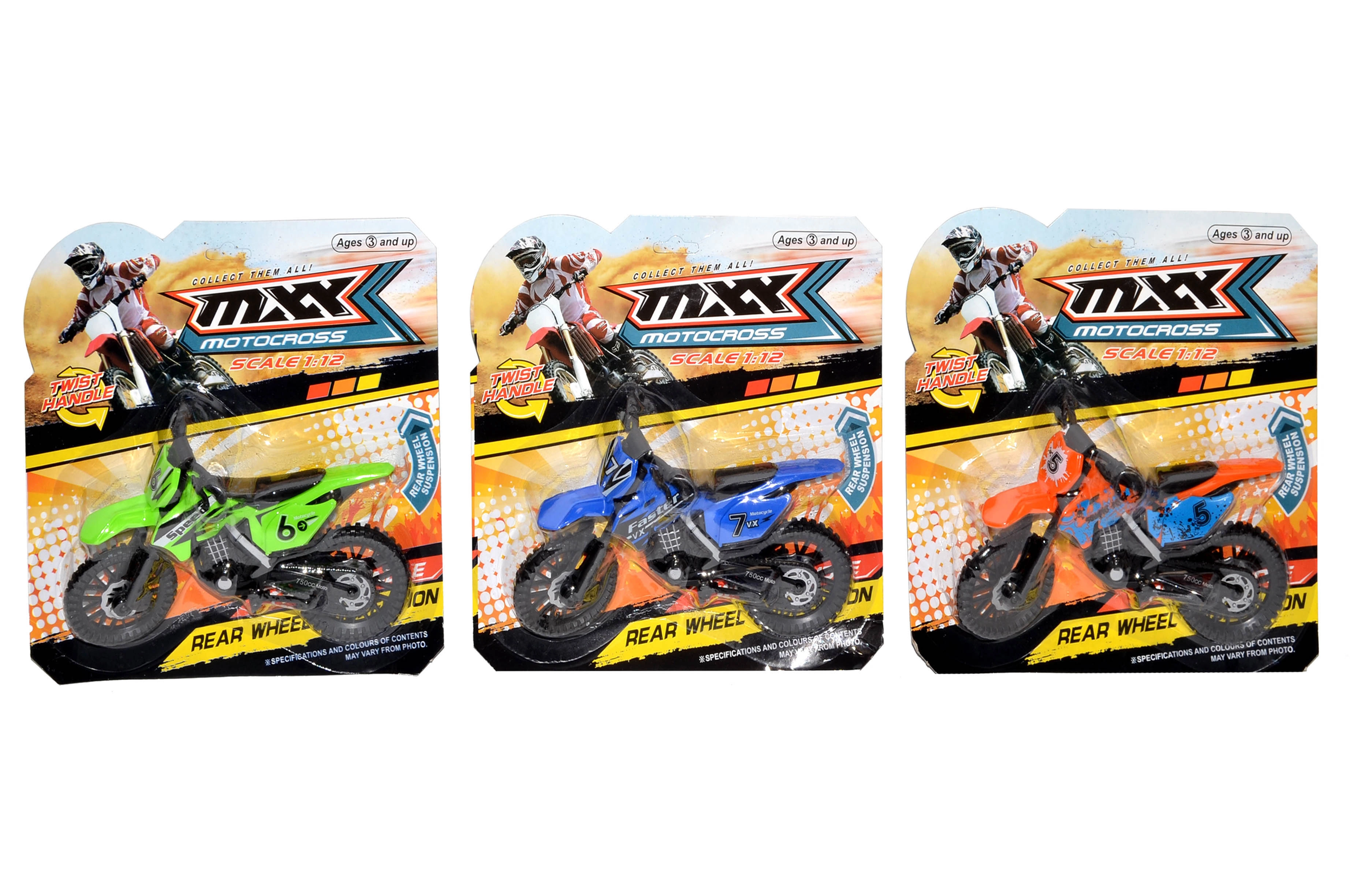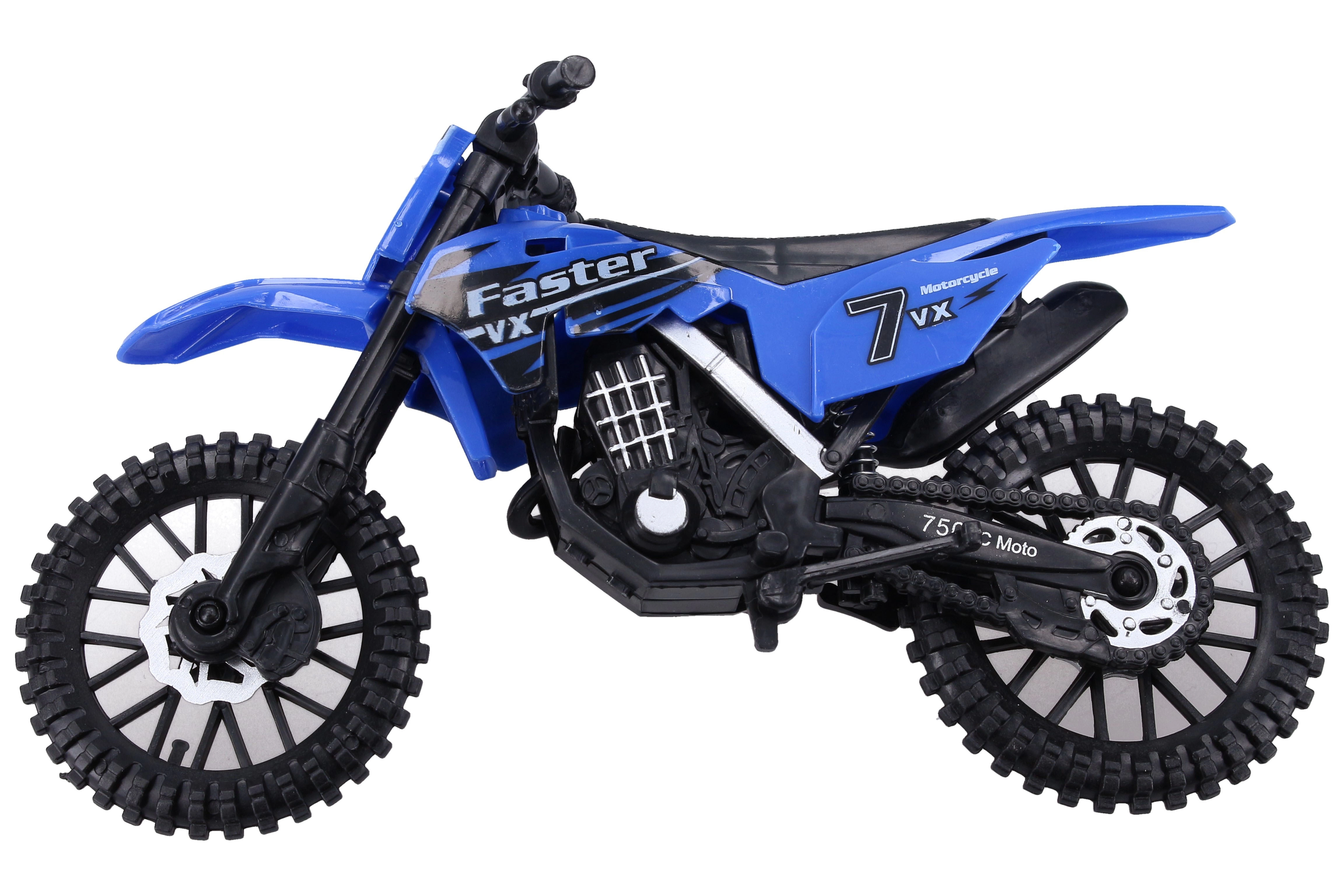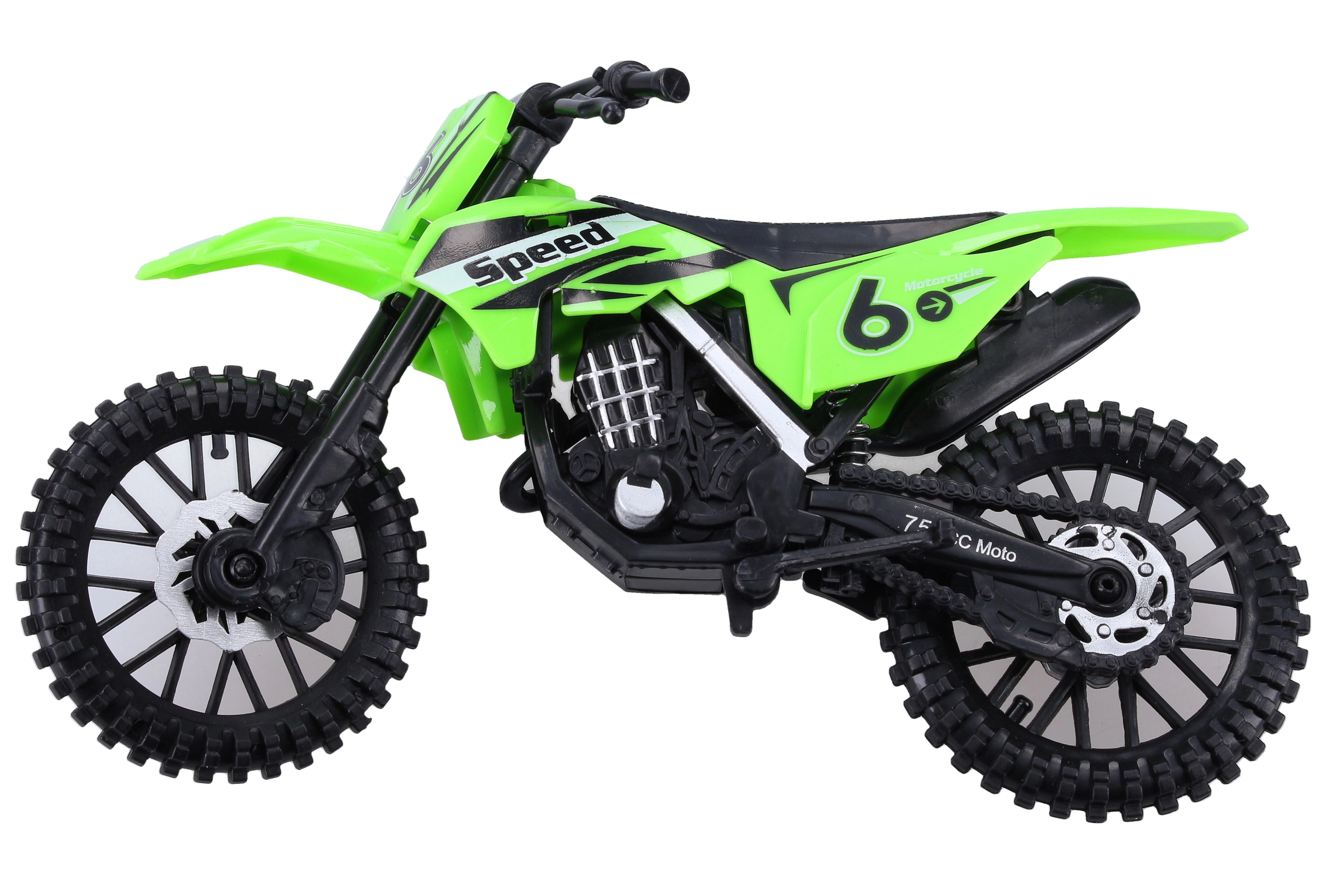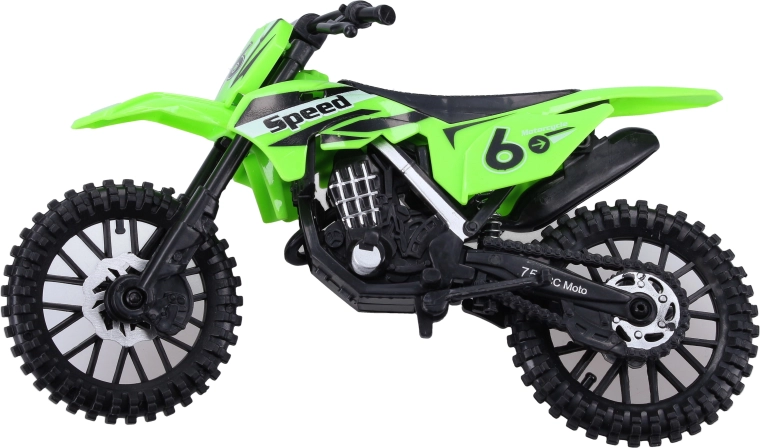 Stylowy, plastikowy motocykl terenowy o długości 19 cm dla małych zawodników. Oferuje swobodnie obracające się koła, realistyczne detale ramy i silnika i jest dostępny w 3 atrakcyjnych kolorach. Świetna zabawka do fantazyjnych przejażdżek i wyścigów w domu i w podróży.