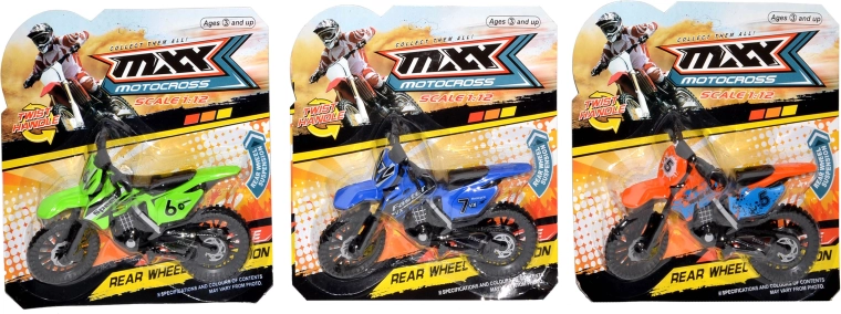 Motocykl jest dostępny w 3 wariantach kolorystycznych z wyścigowymi nadrukami (numery, napisy) i efektownym off-roadowym stylem. Kompaktowy rozmiar 19 cm świetnie leży w dziecięcej dłoni i mieści się w plecaku na wyjazdy.