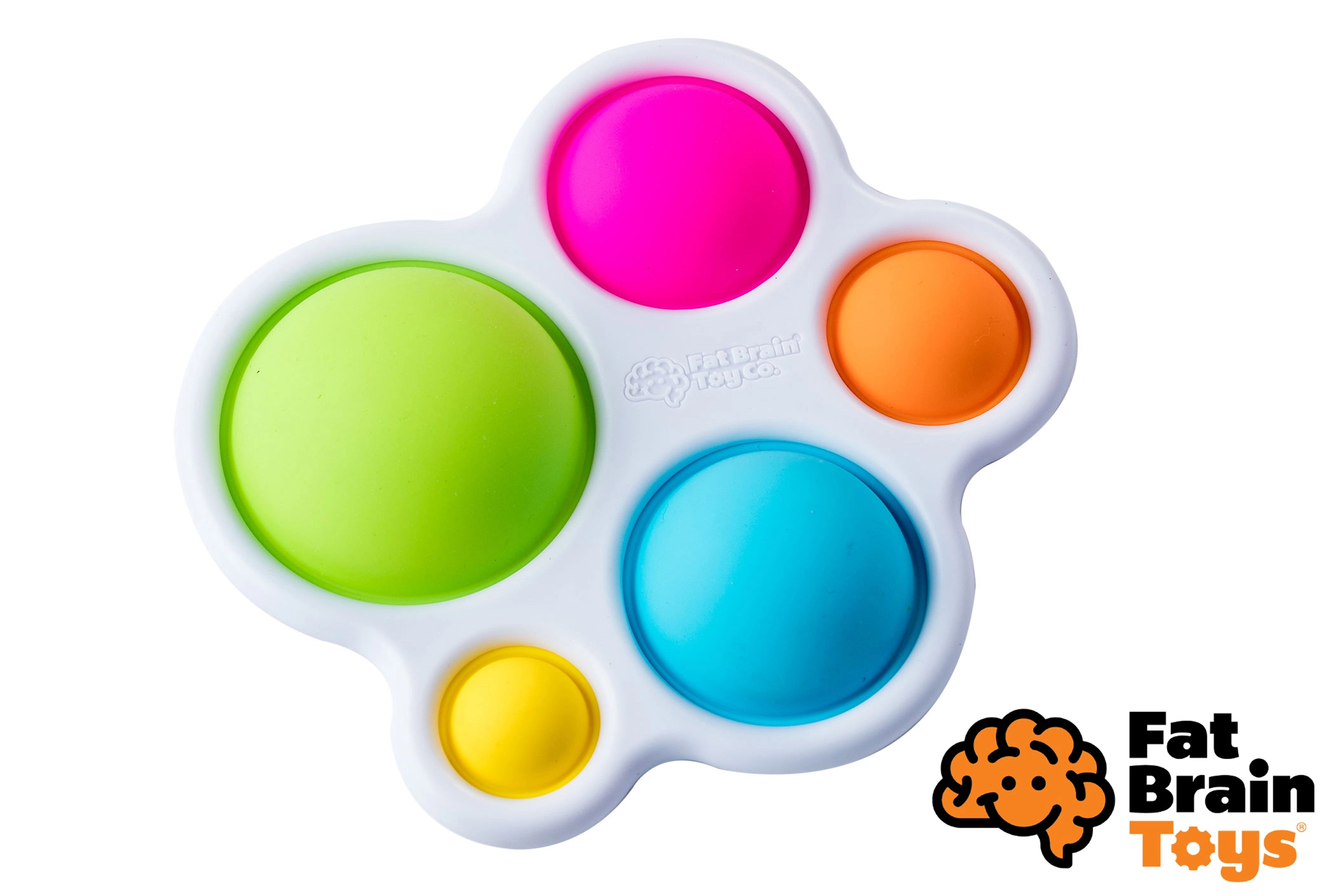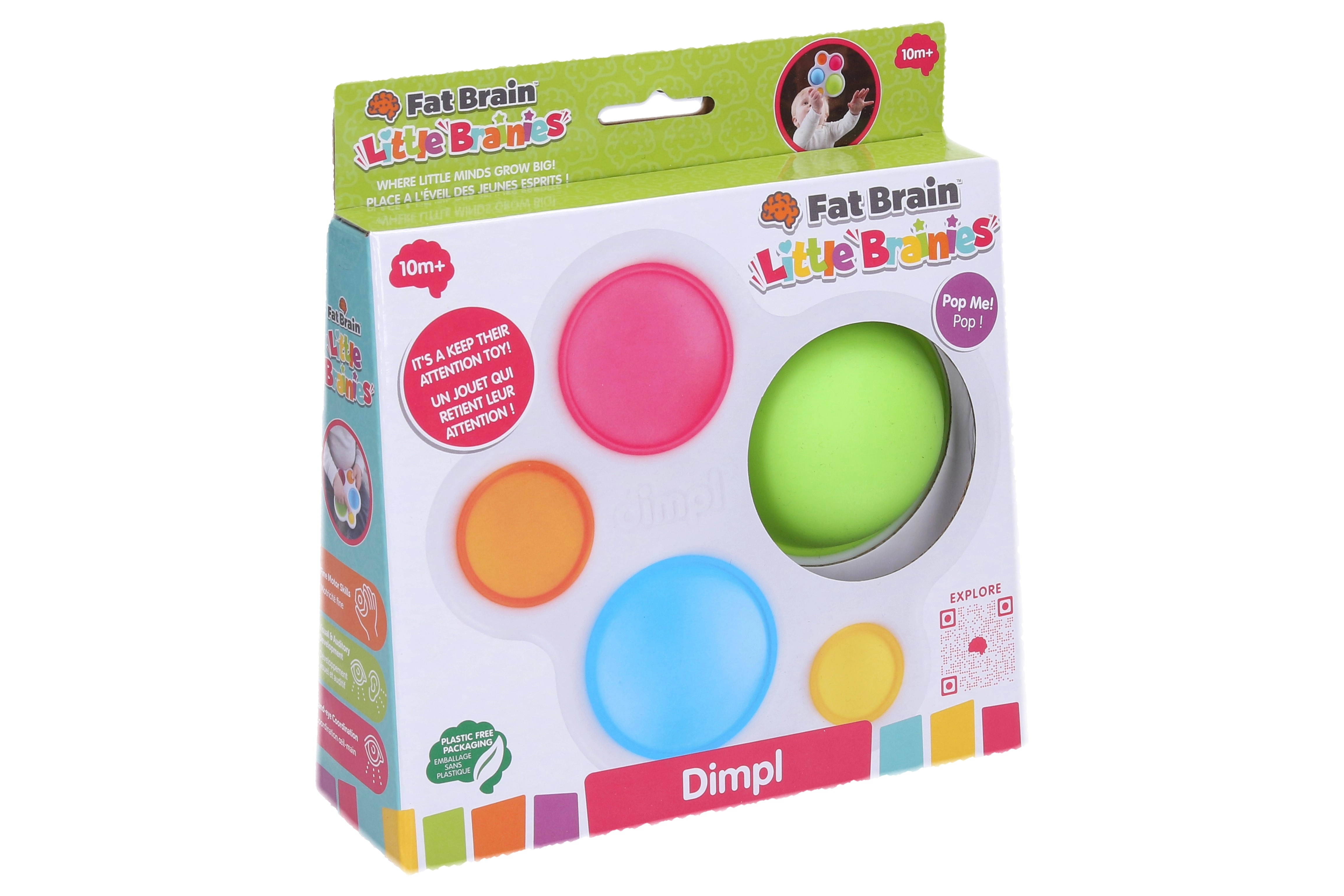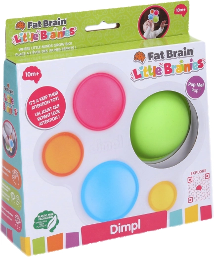 Dimpl od FAT BRAIN to kompaktowa zabawka sensoryczna z pięcioma kolorowymi silikonowymi bąbelkami w solidnej plastikowej ramce. Każdy bąbelek można z obu stron naciskać i „pstrykać”, co natychmiast przyciąga uwagę dzieci i zachęca do wielokrotnego odkrywania.