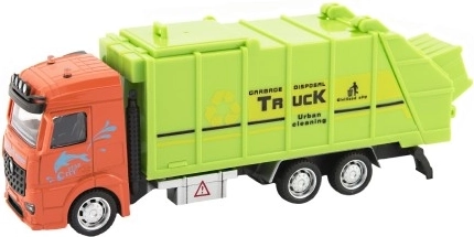 Śmieciarka z pomarańczową kabiną i zielonym nadwoziem wprowadza do zabawy elementy miejskiej konserwacji.