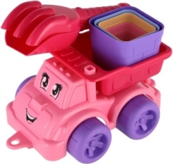 Kolorowa plastikowa ciężarówka z wesołym wyrazem twarzy jest idealna do transportu piasku i rozwijania dziecięcej wyobraźni.