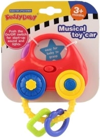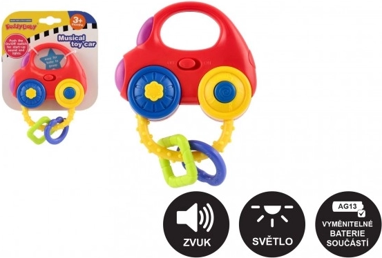 Kolorowe autko–grzechotka zapewnia dzieciom zabawę oraz bodźce wspierające rozwój słuchu, wzroku i małej motoryki. Wystarczy potrząsnąć lub nacisnąć przyciski, a zabawka rozświetli światełka, uruchomi melodie oraz realistyczne dźwięki uruchamiania, jazdy czy trąbienia. Kompaktowe wymiary 10 × 11 cm i zaokrąglone kształty ułatwiają chwytanie nawet najmłodszym.