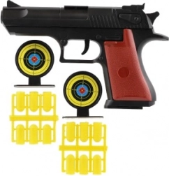 Zestaw zawiera wszystko, czego potrzebujesz: 12 nabojów na długą zabawę oraz 2 okrągłe tarcze do treningu celności. Niewielki, pistoletowy design pobudza wyobraźnię i zabawę w małego policjanta lub sportowego strzelca.