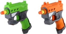 Wysokiej jakości plastikowe wykonanie w atrakcyjnych kolorach (pomarańczowym i zielonym) jest lekkie, wytrzymałe i nie wymaga baterii. W opakowaniu znajdziesz 2 pistole i 6 nabojów, więc masz wszystko do uczciwego pojedynku zaraz po otwarciu.