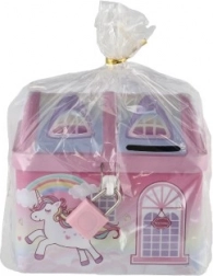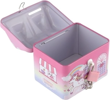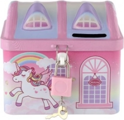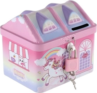 Kolorowa i zabawna skarbonka w kształcie domku to doskonały prezent dla dzieci, które chcą bezpiecznie przechowywać swoje oszczędności. Ten metalowy domek z motywem jednorożca i tęczy nie tylko chroni skarby, ale również zdobi pokój dziecięcy.