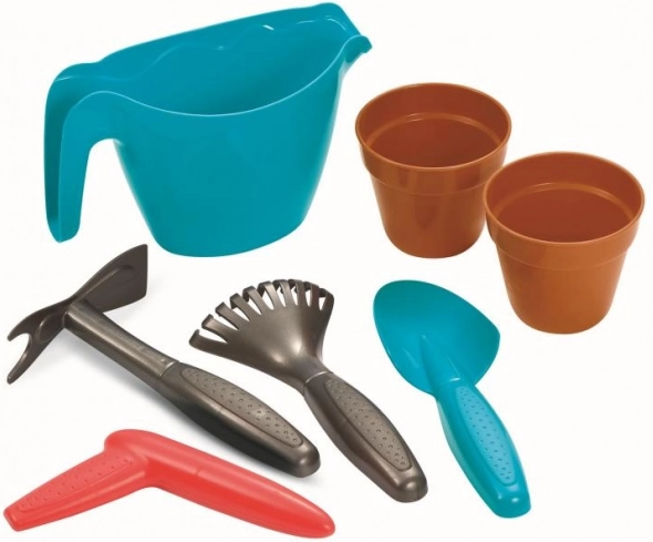 W komplecie znajduje się pełny zestaw narzędzi: konewka do podlewania, dwa doniczki na pierwsze nasadzenia, łopata, grabki, szpadel i pikownik. Dzieci ćwiczą w ten sposób małą motorykę, współpracę i relację z naturą.