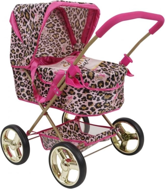 Wózek wyróżnia się wszędobylskim wzorem w panterkę, połączonym z różowymi akcentami, co zachwyca dzieci i rodziców.