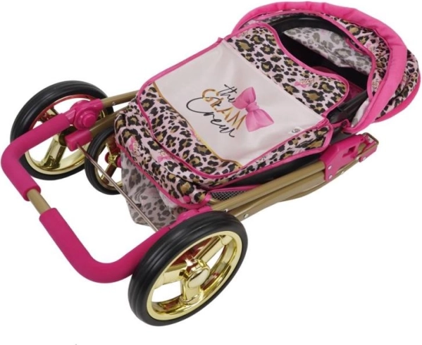 Luksusowy wygląd z nadrukiem w leopardzie cętki oraz różowymi i złotymi akcentami nadają wózkowi unikalny charakter.