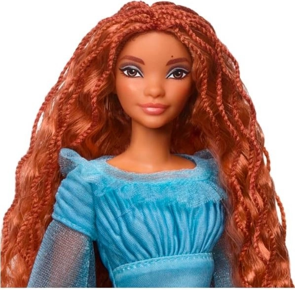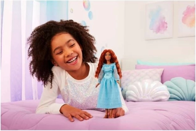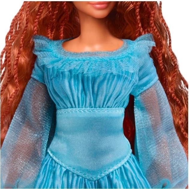 Lalka Ariel wiernie odzwierciedla wygląd z filmu Disney Mała Syrenka – od delikatnego makijażu po ikoniczną niebieską sukienkę, która pobudza wyobraźnię podczas zabawy.