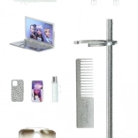 stojak, grzebień, wieszaki, okulary, telefon z etui, mini laptop, butelka