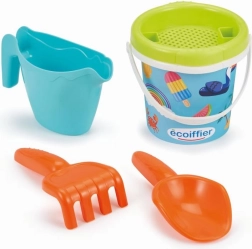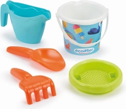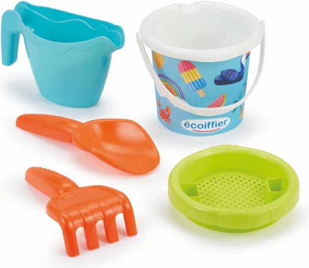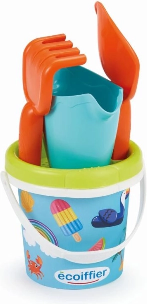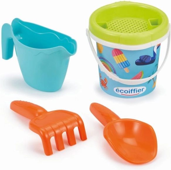 Dziecięce wiadereczko z letnim motywem i praktycznymi akcesoriami do piasku: konewka, sitko, grabki oraz łopatka.
