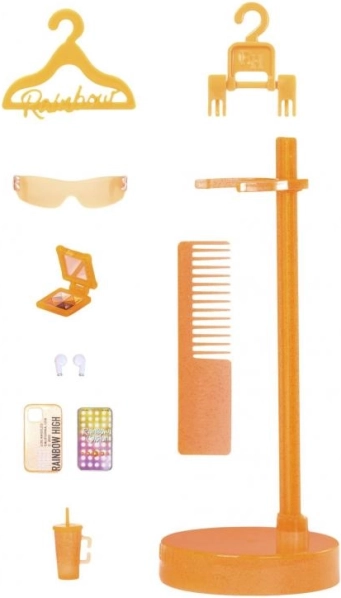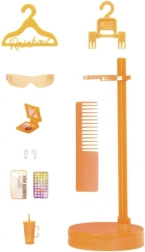 Lalka posiada wiele stylowych akcesoriów, w tym grzebień, okulary przeciwsłoneczne, wieszaki, paletkę do makijażu i kubeczek na napoje, co czyni ją doskonałym miejscem do stylizacji i zabawy.