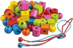 Zabawny zestaw dużych drewnianych koralików ze sznurkiem i kartami wzorów do pierwszego nawlekania. Wspiera motorykę małą, koordynację ręka–oko oraz rozpoznawanie kolorów i kształtów. Bezpieczne wykonanie, koraliki o średnicy 20 mm są łatwe do trzymania nawet dla najmłodszych.