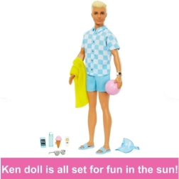 Twórz letnie opowieści pełne słońca i zabawy z Kenem przygotowanym na plażę. Stylowy niebieski strój, lekka koszula i tematyczne akcesoria oferują nieskończone możliwości zabawy i opowiadania historii. Dzięki detalom, takim jak logo na klapkach czy przypięty rożek z lodami, scenki wyglądają realistycznie i zabawnie.