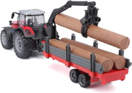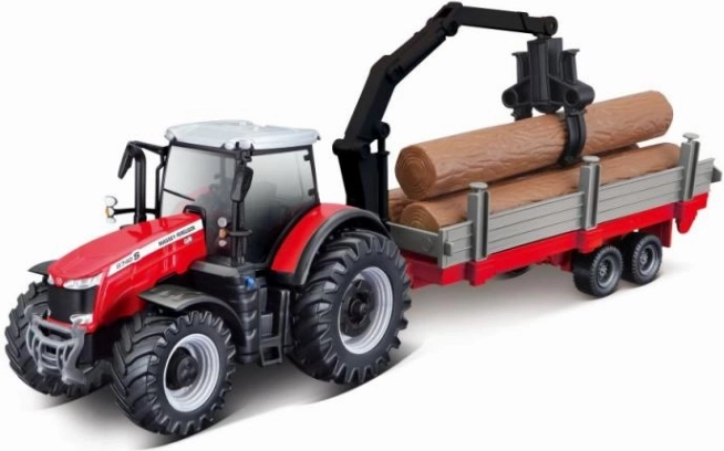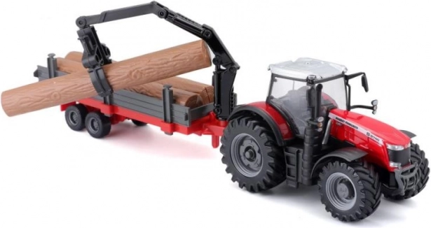 Model rolniczego traktora Massey Ferguson z przyczepą do drewna.