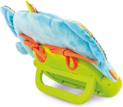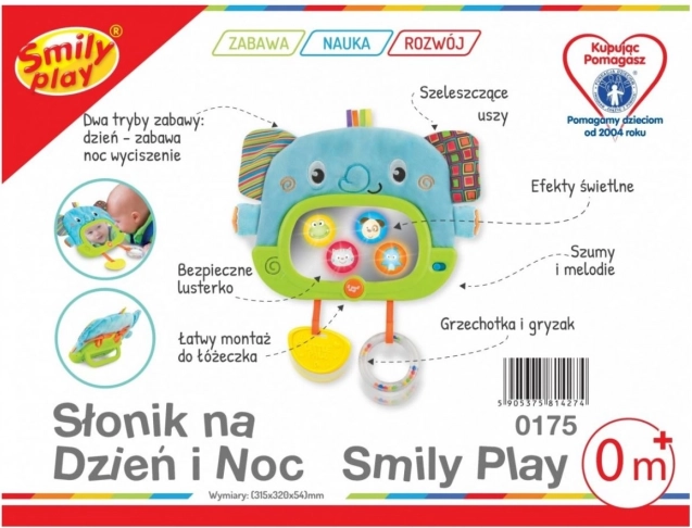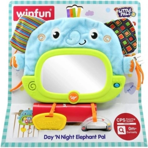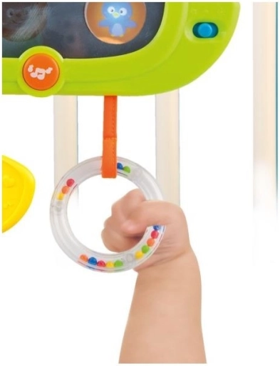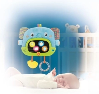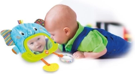 Brelok ma automatyczne wyłączanie (30 sekund w dzień i 3 minuty w nocy). To zabawka pełna niespodzianek. W bezpiecznym lusterku pojawiają się ukryte zwierzęce postacie i delikatnie świecą. Szeleściące uszy stymulują słuch i dotyk. Gryzak łagodzi obolałe dziąsła. Grzechoczące kuleczki przyciągają uwagę kolorami i dźwiękiem. Faktury materiałów pokazują, że coś może być miękkie lub twarde, gładkie lub chropowate.