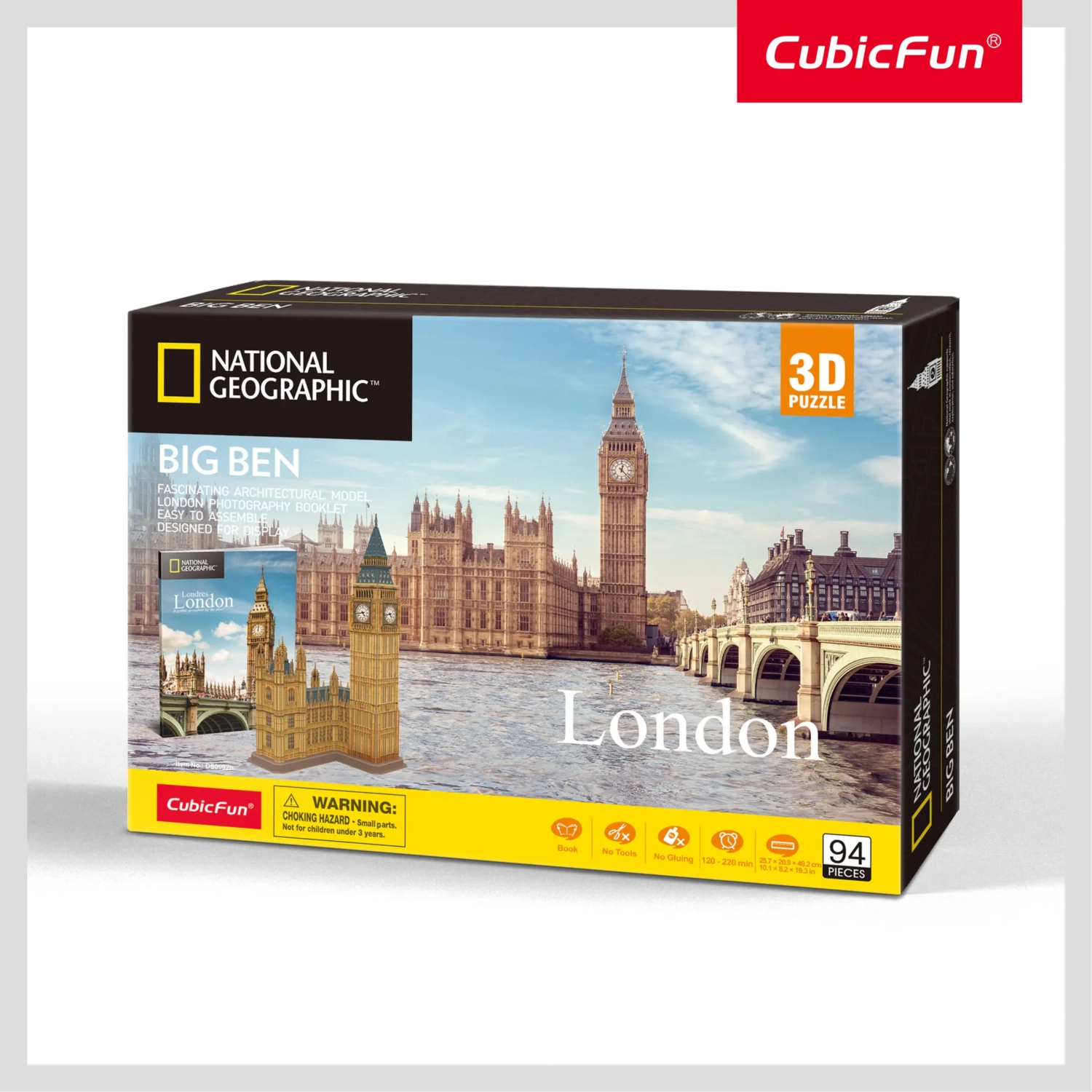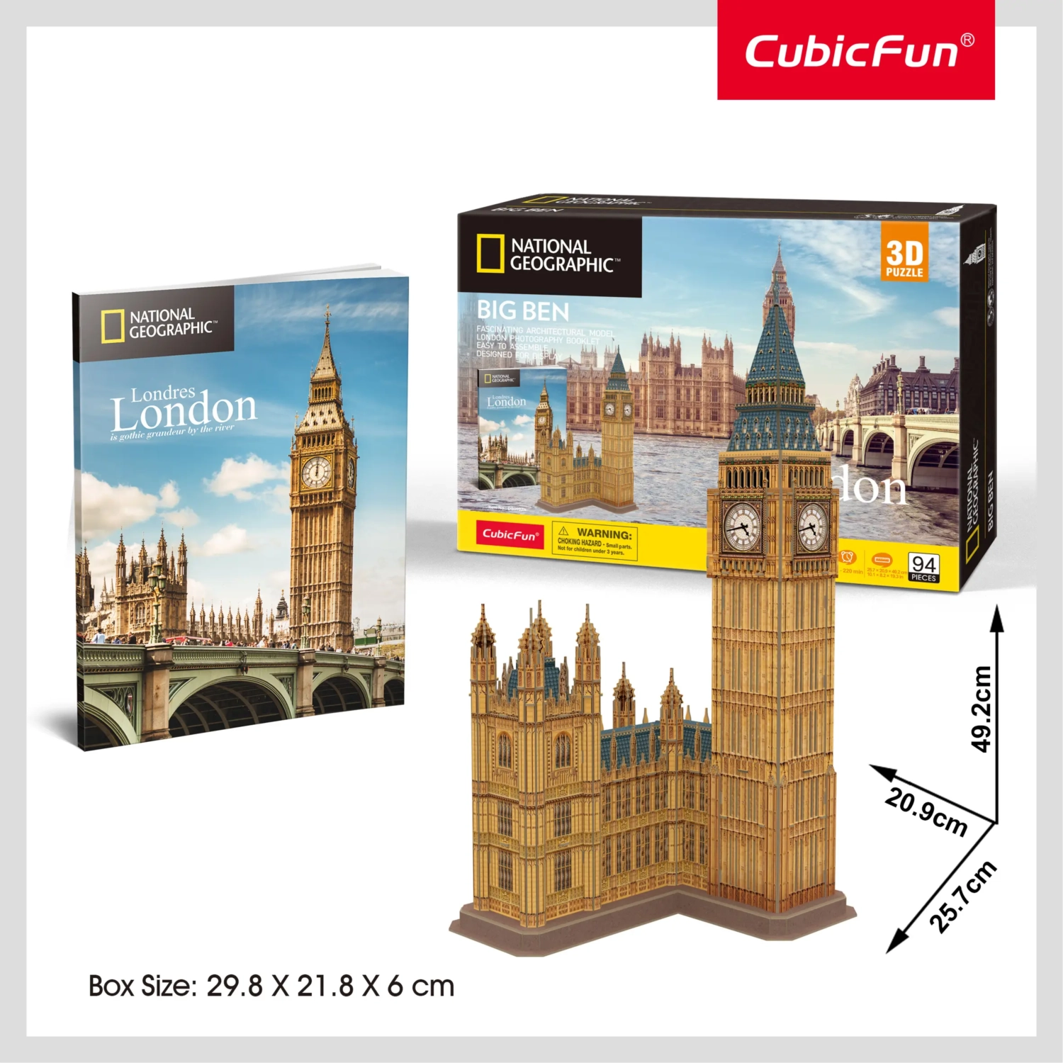 Ikoniczny Big Ben jako realistyczne puzzle 3D NATIONAL GEOGRAPHIC od CUBICFUN. Elementy z solidnej pianki 3 mm z laminowanym nadrukiem złożysz bez kleju i nożyczek. Orientacyjny czas budowy 120–220 minut, wymiary gotowego modelu 25,7 × 20,9 × 49,2 cm. W zestawie przewodnik po Londynie (EN). 94 elementy gwarantują świetną zabawę i elegancką dekorację.