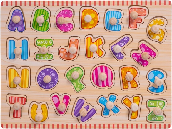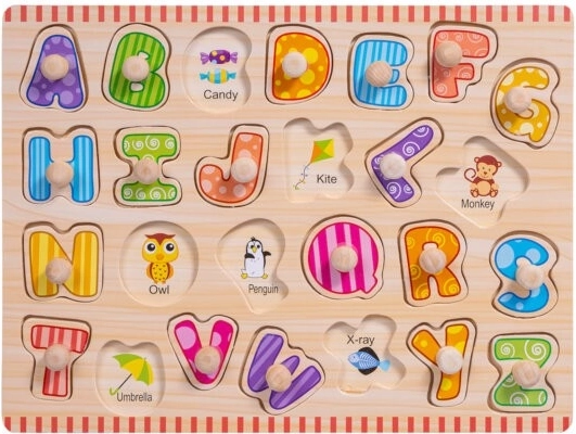 Drewniane puzzle Alfabet z uchwytami to świetna edukacyjna zabawka, która pomaga dzieciom poznawać kształty i kolejność liter alfabetu. Tablica zawiera wycięcia w kształcie liter, do których dzieci umieszczają odpowiadające im kolorowe elementy. Każdy element ma mały uchwyt dla łatwej manipulacji, co wzmacnia motorykę małą i koordynację ręka-oko. Dopasowanie właściwej litery do angielskiego słowa i ilustracji na tablicy dodatkowo wspiera naukę poprzez skojarzenia wzrokowe.