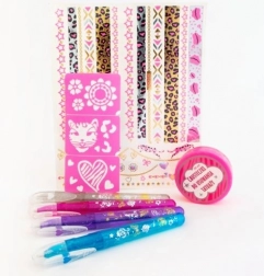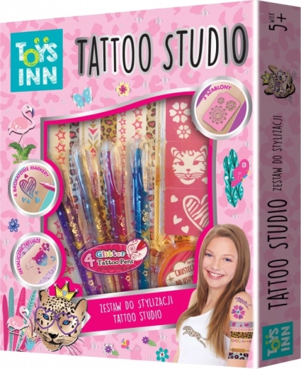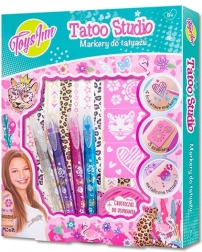 - Zestaw markerów do tatuaży zawiera: 4 brokatowe markery do tatuaży, 3 szablony, 1 arkusz metalicznych tatuaży, 30 chusteczek do usuwania tatuaży.