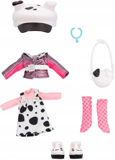 - Sukienka, kurteczka z eko‑skóry, skarpetki, buty Mary Jane, czapka z uszkami, torebka, naszyjnik BFF i inne niespodzianki (łącznie 9+)