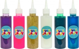 - 6 żelowych płynów (150 ml) w kolorach: różowy, biały, fioletowy, turkusowy, niebieski i brokatowy