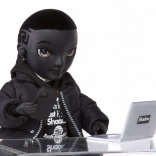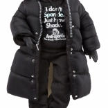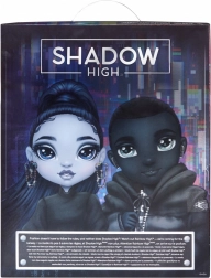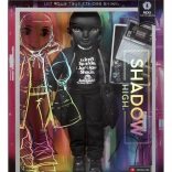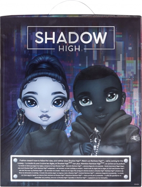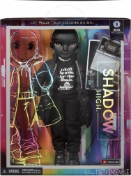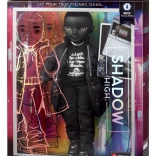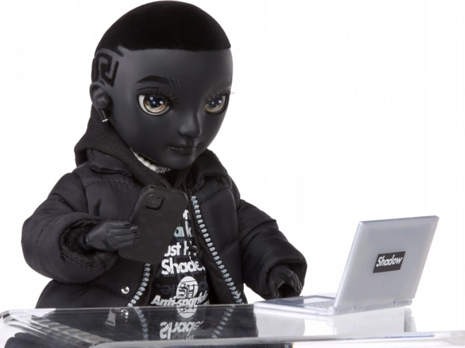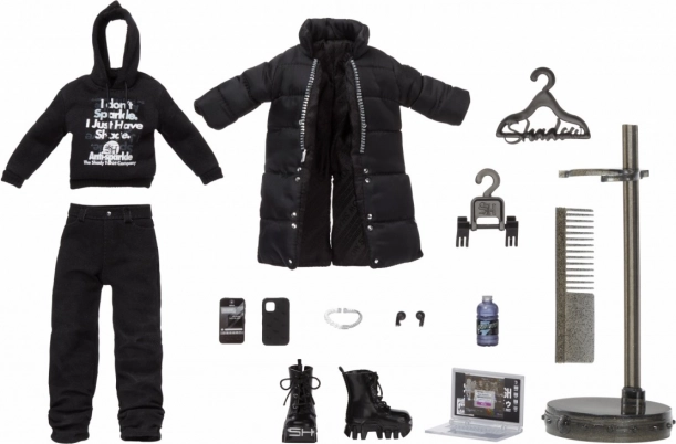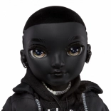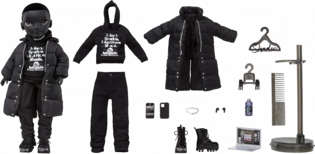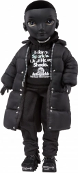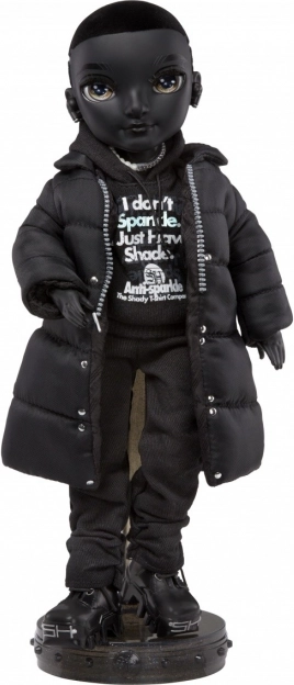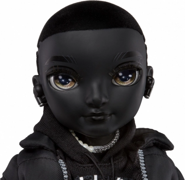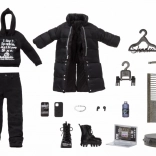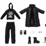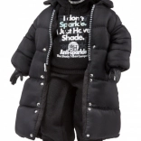 Lalka jest ubrana w stylowy czarny strój z nowoczesnym i miejskim wyglądem, w tym długi czarny płaszcz i akcesoria.