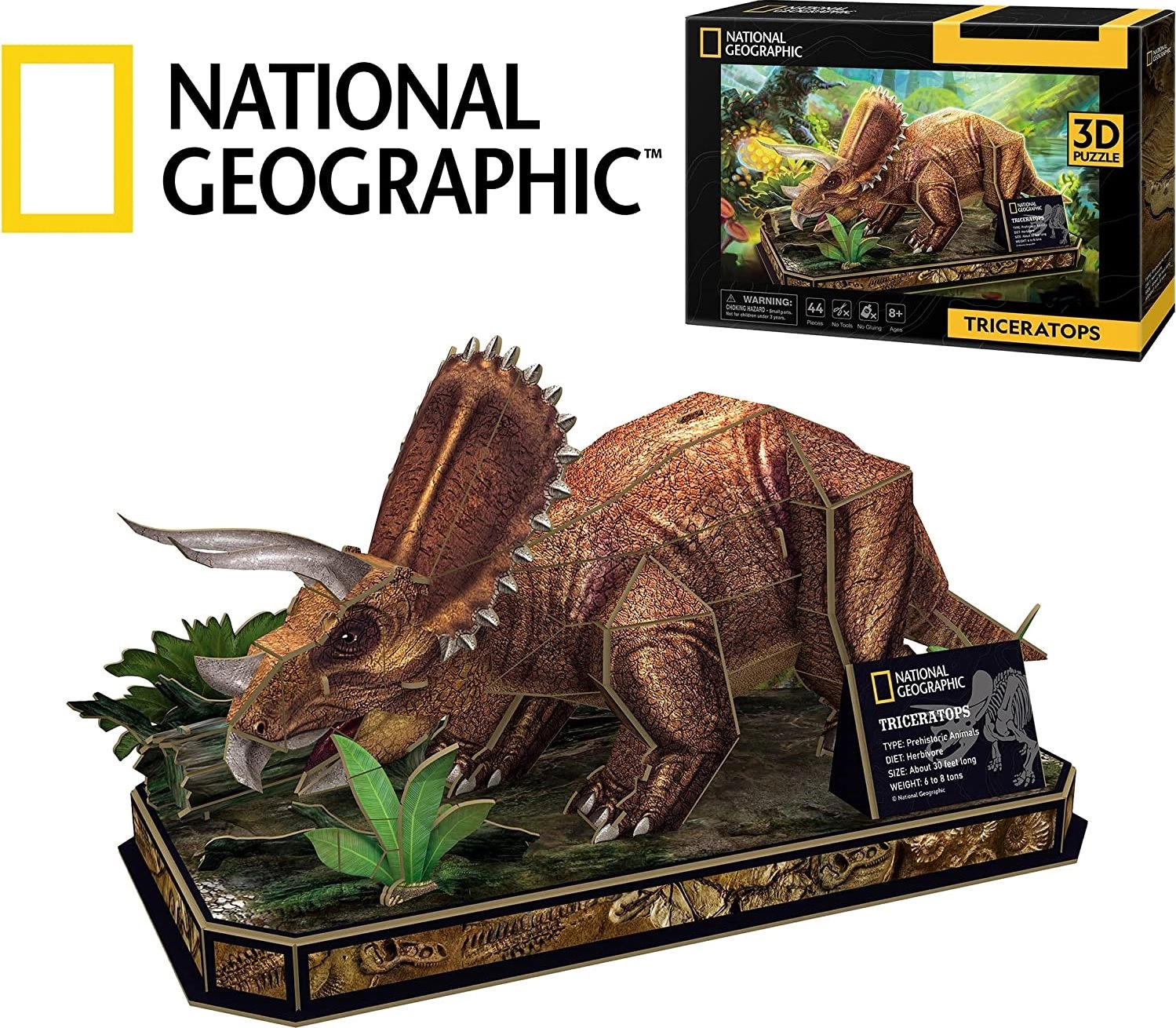 Odkryj zabawny i pouczający świat dinozaurów z modelem Triceratopsa od National Geographic. Ten zestaw puzzli 3D zawiera 44 elementy z wstępnie wyciętego papieru i piankowej płyty, które są lekkie, bezpieczne i realistyczne. W zestawie znajduje się ilustrowana instrukcja, podstawka i tabliczka z nazwą, dzięki czemu możesz stworzyć własną muzealną ekspozycję.